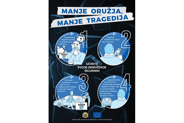 Pozivamo i građane koji još uvijek čuvaju neregistrirano oružje ili eksplozivna sredstva da ih bez straha od sankcija predaju policiji. Također molimo građane koji slučajno pronađu bilo kakvo eksplozivno sredstvo ili oružje da ga ne diraju, već odmah pozovu policiju na broj